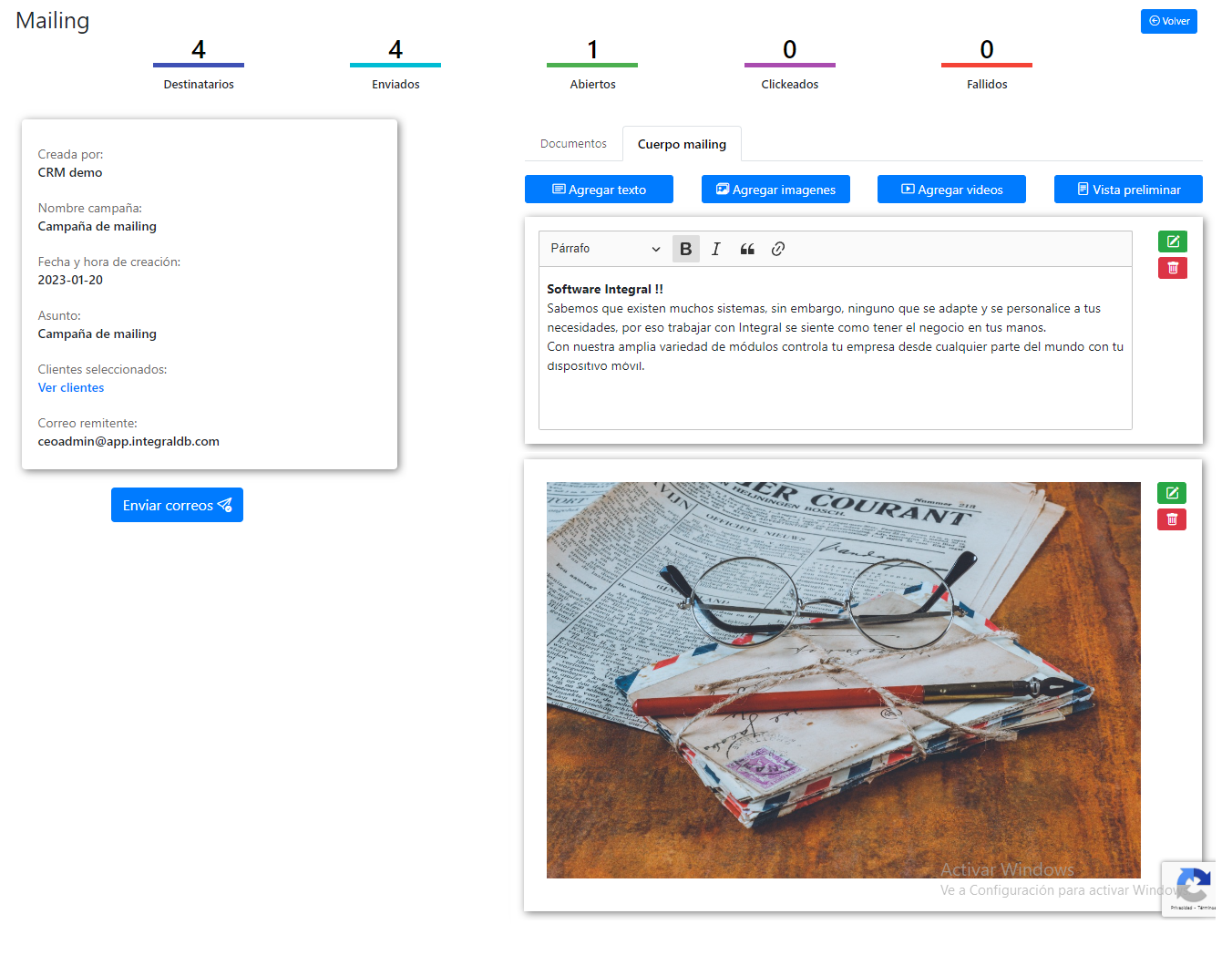* Crea el cuerpo de tu correo de forma personalizada eligiendo textos, imágenes o videos.
